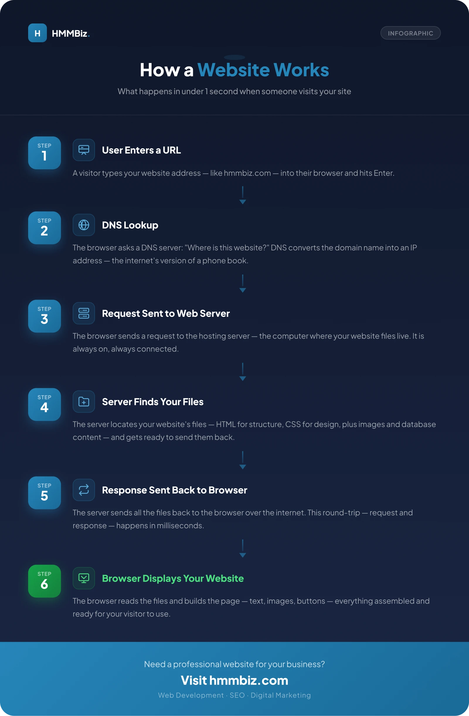 When someone types your domain name, they are essentially calling your business. Your domain — like hmmbiz.com — is your identity online. Without a clear, memorable address and proper DNS setup, customers cannot find you. Domain selection and configuration matter from the start.